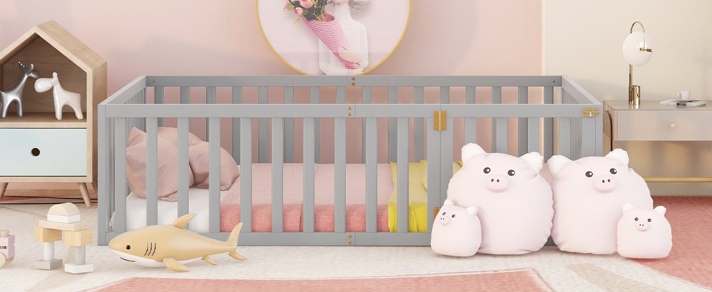 [Fun Design]This wooden floor bed frame has a circle of fences. There is a small door that can be opened and closed, which increases the interest of the bed and creates a more safety sleeping space.