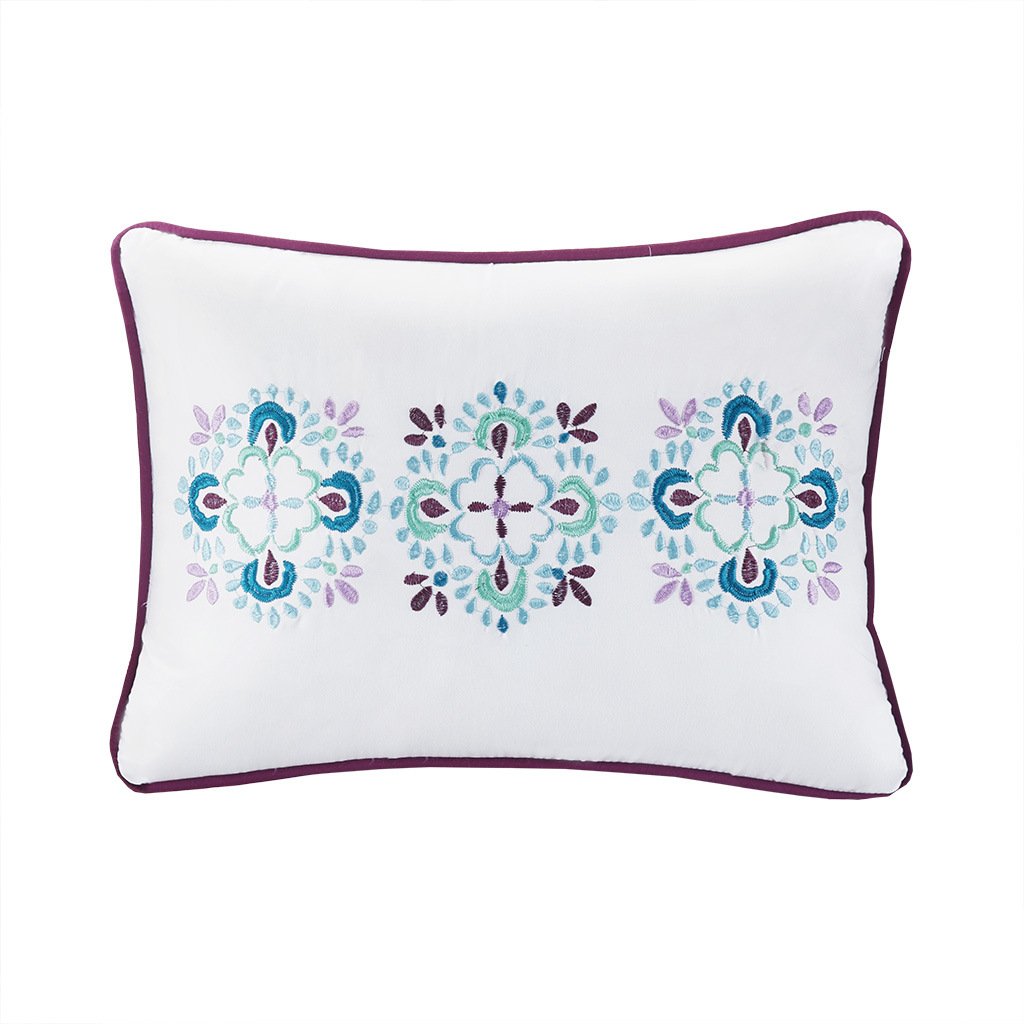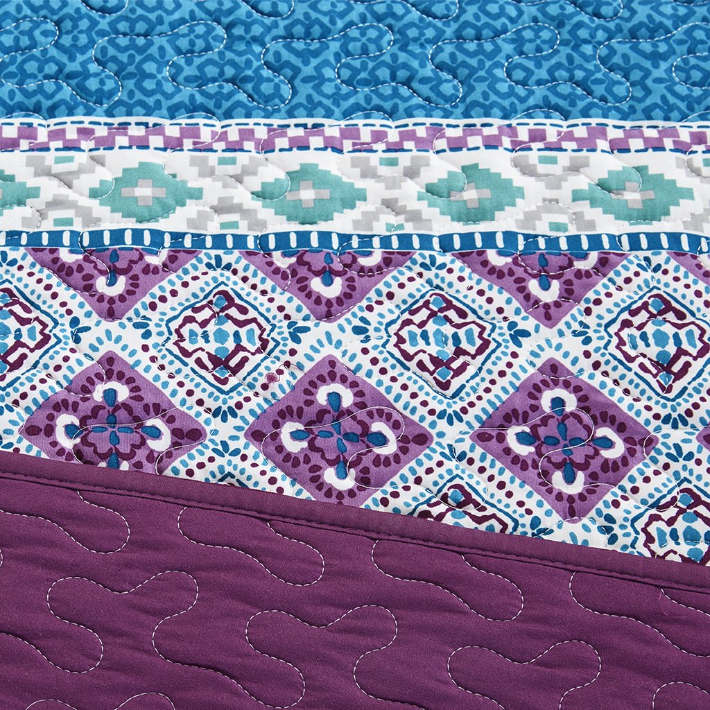 Update your guest bedroom with the chic boho flair of the Intelligent Design Joni 6 Piece Boho Reversible Daybed Set. Featuring several globally inspired prints, this daybed flaunts bold and bright colors with a solid purple reverse to create a gorgeous boho look. The 3 coordinating shams complement the design of the daybed cover, while 1 decorative pillow and a solid purple bedskirt add the finishing touches. Pre-washed cotton filling provides extra durability and comfort. This bedding set is OEKO-TEX certified, meaning it does not contain any harmful substances or chemicals, and uses an antimicrobial treatment that provides built-in freshness protection, reducing the growth of odor causing bacteria to keep fabric lasting longer. The daybed cover easily fits a Twin size mattress.