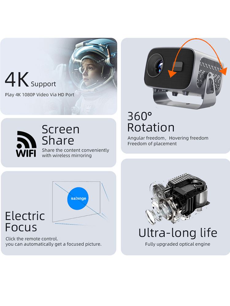 Product Description The A10 Smart Projector delivers exceptional home entertainment with native 720P resolution and 4K video support. Powered by the T950S quad-core processor and 2+16GB memory, it ensures smooth performance for all your viewing needs. Featuring 200 ANSI lumens brightness and automatic focus with keystone correction, setup is effortless. With dual-band WiFi, Bluetooth 5.0, and Android 13 system, it's perfect for streaming, gaming, and movie nights. The long 30000-hour lamp life makes it a reliable choice for years of entertainment.